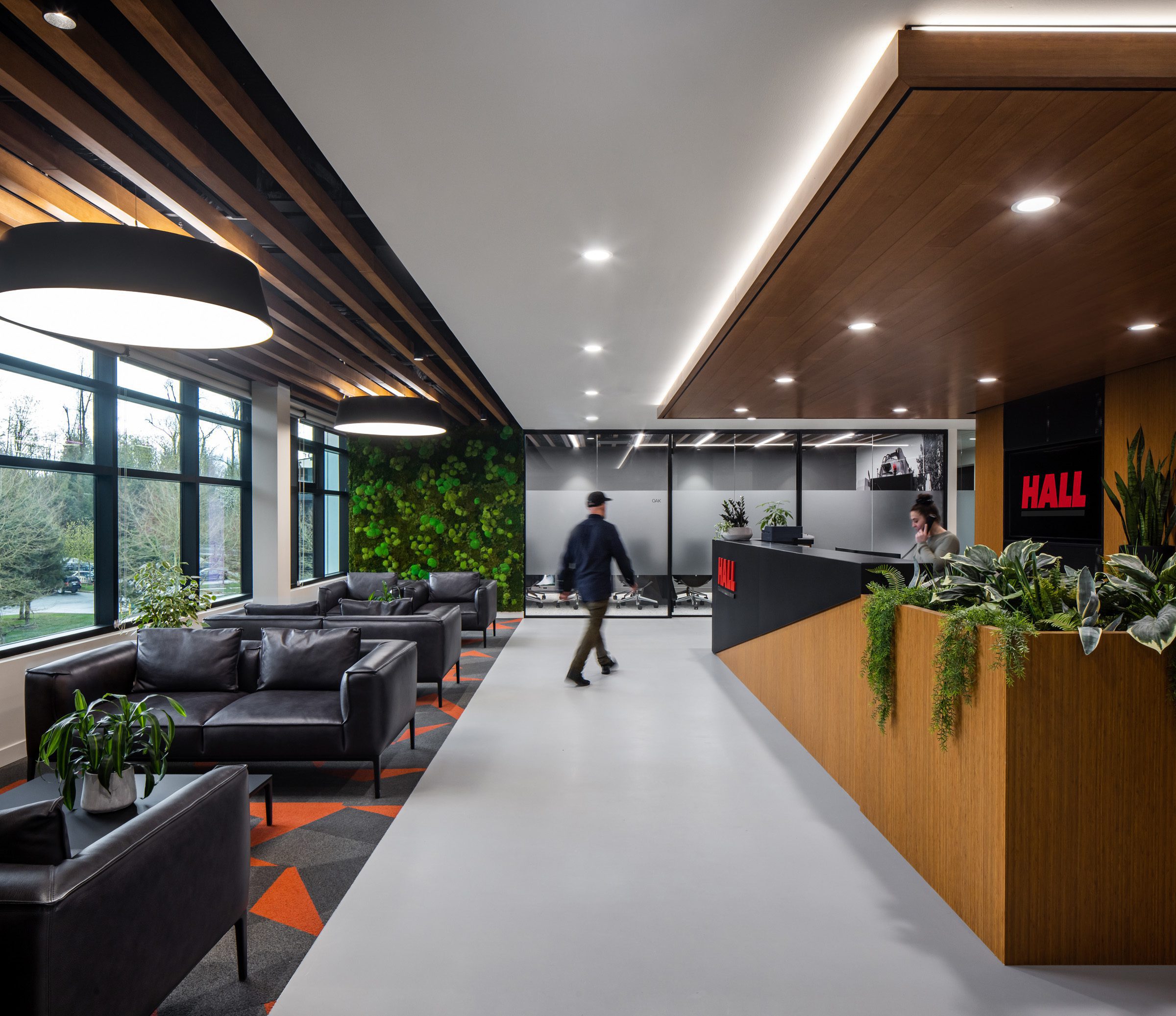 With three floors of a brand-new building, Hall Constructors had room to build the office their team actually needed — and they wanted to get it right. We started with an in-depth survey of their people: how they preferred to work, meet, and move through a space. The result balances private offices with well-positioned open areas and meeting rooms that feel like destinations rather than afterthoughts. An expansive gathering space anchors the headquarters, giving the whole company a place to come together.