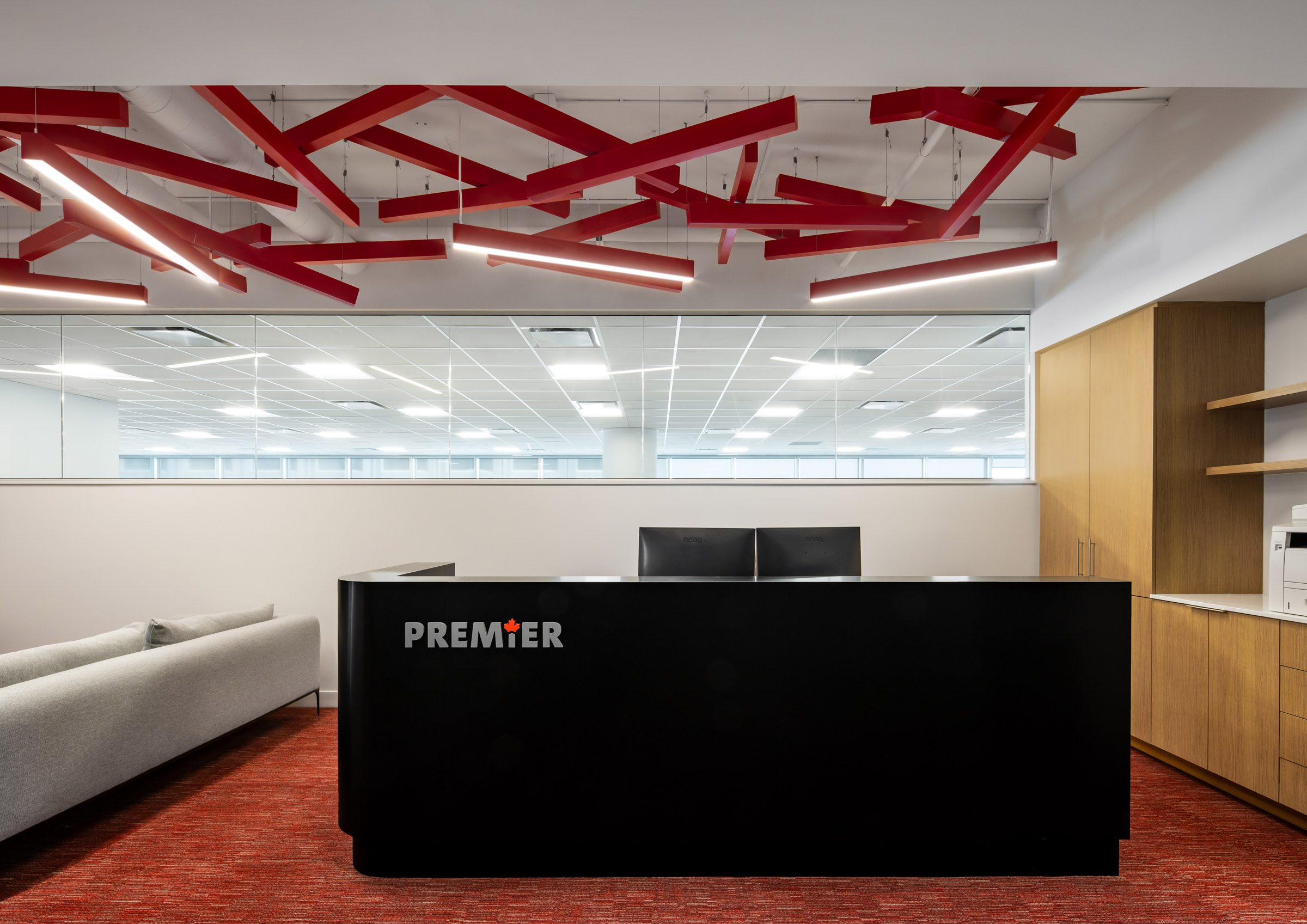 Taking over the 17th floor at 601 West Hastings meant Premier Insurance could consolidate their operations onto a single, well-considered floor plate. Elevating their brand presence was central to the brief — and we leaned into it. A bold red portal at arrival sets the tone; a custom ceiling installation above reception announces that this is not a generic professional office. Security needs and an open feel are balanced through strategic glass placement, keeping the floor connected without compromising function.
