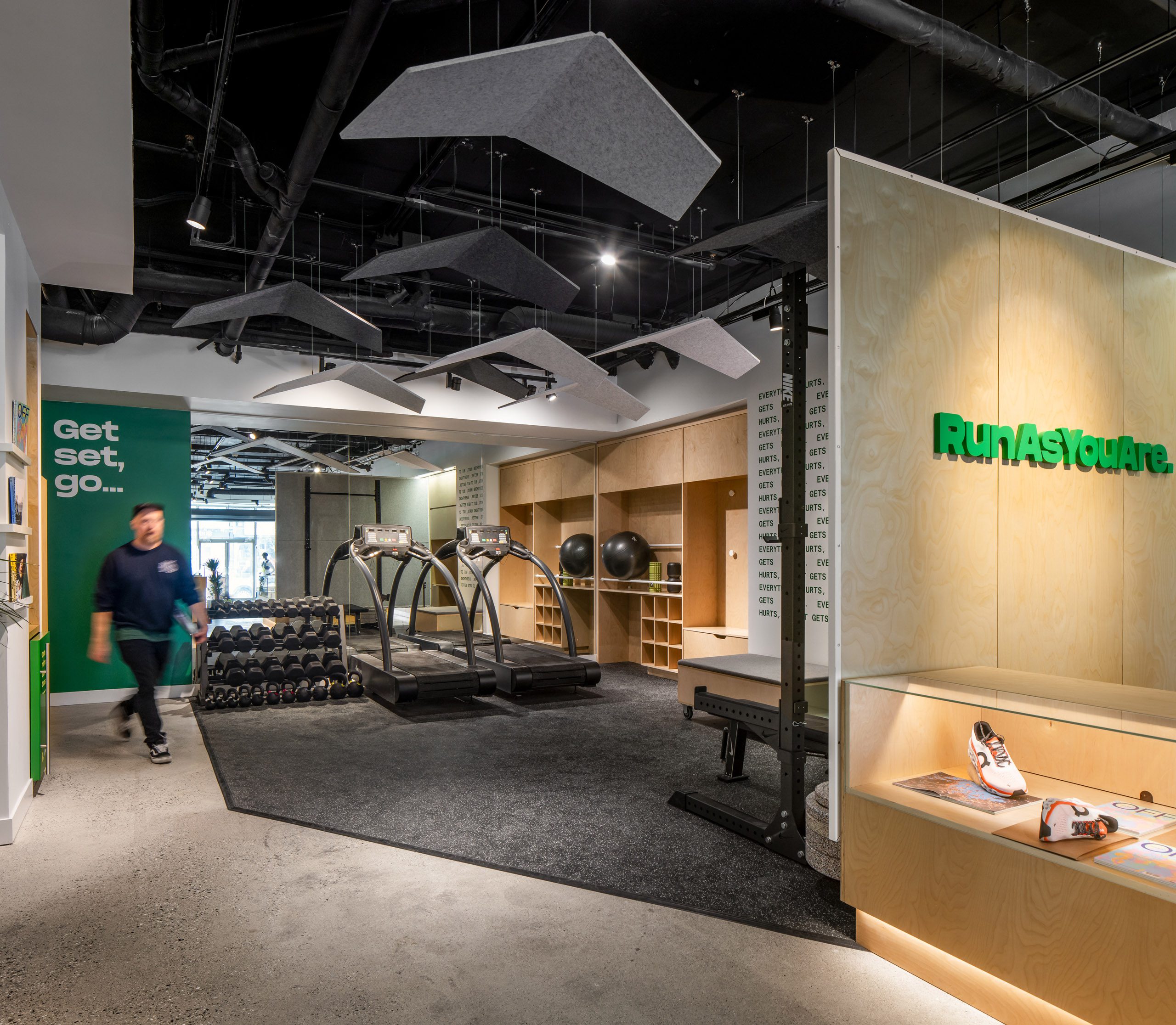 Spacious lounge-inspired fitting rooms offer comfort and privacy. A dedicated diagnostics training area supports runners with specialized assessment equipment. Sound mitigation was carefully incorporated to reduce treadmill noise and create a serene environment for physiotherapy and massage treatments.